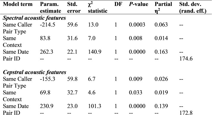 Extended Data Table 4 Results for linear mixed model assessing whether calls are specific to individual receivers or the type of relationship between caller and receiver