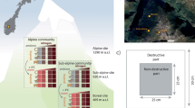 We examined responses at the species level that underlie community-level responses. We identified the species that increased or decreased in abundance over time at each observational site, especially those that established in the community (appeared after the first 5 years) or extirpated from the community (disappeared in the last 5 years) (Supplementary Fig. 16)21. A similar comparison was conducted for the experiment, by identifying the species that increased or decreased in abundance in the warming treatment compared with the ambient treatment (Supplementary Fig. 17). We compared the temperature and precipitation niche centroid among species that increased, decreased or had no change in abundance under climate change using the two-sided Wilcoxon test, robust to outliers in species’ niche centroid (Fig. 4c,d). To explore whether community compositional shifts were driven by dominant or rare species, we further compared the rank abundance curves over time at observational sites (Supplementary Fig. 18) and between ambient and warming treatments in the experiment (Supplementary Fig. 19). We compared the evenness of communities measured by Pielou’s evenness J over time (linear regression, two-sided t-test) or between treatments (two-sided Wilcoxon test, P ≤ 0.05).