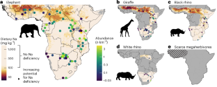 We acknowledge many funding bodies that have facilitated this project, including NASA awards 16-HW16_2-0025 and 18-SLSCVC18-0032 (C.E.D. and A.J.A.), a Google Earth Engine research award (C.E.D. and A.J.A.), Horizon Europe Marie Skłodowska-Curie Actions grant agreement number 101062339 (A.J.A.), the Royal Society Newton International Fund and the Independent Research Fund Denmark’s (Danmarks Frie Forskningsfond (DFF)) Inge Lehmann programme under grant agreement number 1131-00006B (E.L.R.), the Carlsberg Foundation Semper Ardens project MegaPast2Future grant CF16-0005 (J.-C.S.), the Center for Ecological Dynamics in a Novel Biosphere (ECONOVO) funded by Danish National Research Foundation (grant DNRF173) and VILLUM Investigator project ‘Biodiversity Dynamics in a Changing World’ funded by VILLUM FONDEN grant 16549 (J.-C.S.), AfricanBioServices project funded by the European Union’s Horizon 2020 research and innovation programme under grant agreement 641918 (J.G.C.H. and M.P.V.) and the US National Science Foundation IOS-1656527, DEB-2225088 (R.M.P.). We thank the management and staff of all wildlife reserves within which research was conducted. In particular, we thank the Tswalu Foundation for their financial support and facilitation of this project. We also thank K. Parr, E. Lundgren, O. Baines and members of the International Network to study Deposition and Atmospheric composition in Africa (INDAAF) for helpful comments during the preparation of this paper, J. Lloyd and K. Rode for sharing of data and D. Leese and S. Abraham for their help in collecting faecal samples.