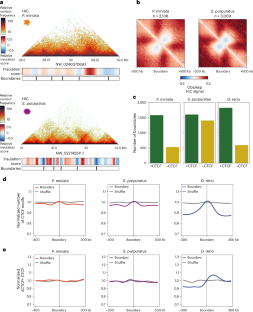 a, Heatmaps showing normalized HiC signal at 10-kb resolution in A. amurensis. Insulation scores and computationally called TAD boundaries are plotted below the heatmaps. b, Aggregate analysis of the observed versus expected HiC signal around TAD boundaries called at 10-kb resolution in A. amurensis (top) and D. melanogaster (bottom). c, Boxplots showing the distribution of boundary scores (left) and TAD sizes (right) in P. miniata (boundaries n = 2,108, TADs n = 2042), S. purpuratus (boundaries n = 3,009, TADs n = 2880), A. amurensis (boundaries n = 1,596, TADs n = 1566) and D. melanogaster (boundaries n = 476, TADs n = 484). d, Aggregate peak analyses of HiC loops in P. miniata, S. purpuratus, A. amurensis and D. melanogaster. The observed vs. expected HiC signal is shown. e, Boxplots showing the distribution of loop ranges in P. miniata, S. purpuratus, A. amurensis and D. melanogaster. Number of loops in each species as in d. f, Normalized number of ATAC-seq peaks harboring CTCF motifs around HiC loops in P. miniata (left), S. purpuratus (middle) and D. rerio (right). Shuffle control is shown per each graph. Boxplots in c and e show center line, median; box limits, upper and lower quartiles; whiskers, 1.5× interquartile range; notches, 95% confidence interval of the median.