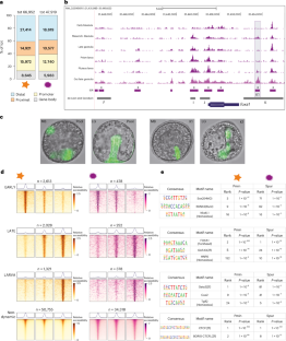 a, Accession numbers of the genome assemblies included in the alignments. b, Counts of pCREs according to their evolutionary strata. c, Genome browser screenshots around the P. miniata pbx1a (LOC119720117, top panel) and the S. purpuratus six1 (LOC110974175, lower panel) genes showing ATAC-seq tracks from different developmental stages (in orange and purple, respectively), IDR peaks (orange and purple bars) and gene models (dark blue). A conserved Asteroidea pCRE (red bar) with late developmental dynamics and Deuterostome and Odontophora pCREs (green bars) with early developmental dynamics are highlighted with gray boxes.