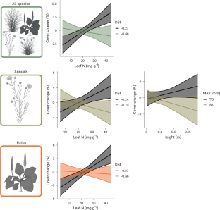Extended Data Fig. 9 Plots displaying the effects of traits and environmental variables on change in population cover for the perennial forb species group (n = 257 populations, species = 169, R2 = 15%).