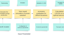 The GeoH2 optimization model is used to calculate the lowest possible cost of H2 achievable throughout each country, assuming an electrolyser lifetime of 20 years. Electrolyser lifetimes are subject to some uncertainty, but do not have a major impact on LCOH52 and most importantly for this analysis, affect the LCOH in European and African countries alike except for a small penalty for Africa-based production due to higher financing costs on the CAPEX. The model tessellates the country into hexagons and calculates the costs to (1) produce the specified quantity of green H2 (or here green NH3) in each hexagon, (2) convert it to the required state for transport and (3) transport it to a specified demand location. In each hexagon, a cost-optimal off-grid H2 plant powered by PV and wind turbines is designed to meet the specified demand. The electrical infrastructure (that is, PV, turbines, battery storage) and plant infrastructure (that is, electrolyser, NH3 storage, compressed H2 storage) are sized for cost optimality using site-specific, hourly weather data from the European Centre for Medium-Range Weather Forecasts Reanalysis v5 dataset53. Here data for the duration of 2022 are used. The Corine Land Cover54 and OpenStreetMap55 datasets are used to constrain land availability in each hexagon, and country boundary base maps are from GADM, which allows free academic re-use. The costs to transport the H2 to port are calculated for both road transport (that is, trucking) and pipeline transport, including construction of necessary infrastructure. Water costs for either desalination or freshwater processing are included as applicable—however, no limit is placed on water consumption to avoid depletion in either case. Cost parameters used in the modelling are available in Supplementary Table 1 and harmonized to 2023 euros using average annual US$/€ exchange rates from the Economic Research Division of the Federal Reserve Bank of St. Louis and an annual average of the Harmonized Index of Consumer Prices from Eurostat. Further details on the GeoH2 model implementation are available in the model descriptor14.