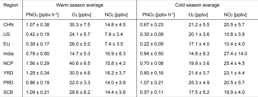 1. Summary of the PNO3, O3 and NO2 in each region during warm and cold seasons during 2018–2019 (average ± standard deviation)