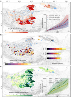 Spatial distribution of length of basin-wide submerged roads under SSP1-2.6 (a) and SSP5-8.5 (b) scenarios. Spatial distribution and time of submerged settlements under SSP1-2.6 (c) and SSP5-8.5 (d) scenarios. Spatial distribution of area of basin-wide submerged grasslands under SSP1-2.6 (e) and SSP5-8.5 (f) scenarios. Credit: map in a,b, OpenStreetMap under a Creative Commons license CC BY-SA 2.0.