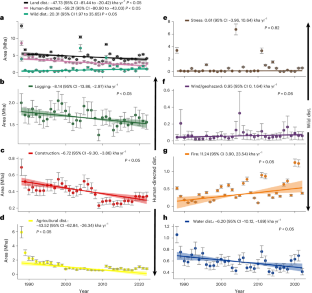 The open-source data include regions of the Fifth National Climate Assessment at https://toolkit.climate.gov/NCA5, USGS Landsat Collection 2 US ARD at https://earthexplorer.usgs.gov, 2012 State Boundaries of United States and Territories at https://purl.stanford.edu/vt021tk4894, Public Events Geodatabase 1999–2022 (Model Ready Events) of LANDFIRE at https://landfire.gov, LCT by https://www.usgs.gov/centers/western-geographic-science-center/science/land-cover-trends, Fire Occurrence Dataset 1984–2022 of MTBS at https://www.mtbs.gov, NLCD 2001–2021 at https://www.usgs.gov/centers/eros/science/national-land-cover-database, Yearly Seasonality of GSW version 1.4 at https://global-surface-water.appspot.com, IDS at https://www.fs.usda.gov/science-technology/data-tools-products/fhp-mapping-reporting/detection-surveys, Severe Weather Database at https://www.spc.noaa.gov, International Best Track Archive for Climate Stewardship at https://www.ncei.noaa.gov/products/international-best-track-archive, Global Landslide Catalog at https://gpm.nasa.gov/landslides/projects.html#GLC and Shuttle Radar Topography Mission (GL1) 30m DEM version 3 at https://lpdaac.usgs.gov/products/srtmgl1v003. The 1988–2022 disturbance dataset generated by this study is available via GitHub at https://github.com/gersl/usdist.