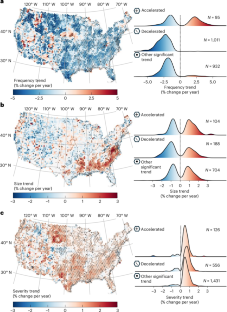 a. Trend of disturbance patch frequency. b. Trend of disturbance patch size. c. Trend of disturbance patch severity. In each panel, (1-7) are the regime trend map of logging, construction, agricultural disturbance, stress, wind/geohazard, fire, and water disturbance. In each map, trends are estimated using the Theil-Sen estimator, and their statistical significance is determined by the two-tailed Mann-Kendall test (p < 0.05), where symbols indicate significantly accelerated (+) and decelerated (−) trends, while dots (•) denote other significant (for example, increasing or decreasing) trends. Each map includes density plots in the lower-left corner, depicting the distribution of trend magnitudes for landscapes with significant trends, categorized as accelerated, decelerated, and other significant trends (from top to bottom). The number presents the number of hexagonal grids with significant trend. The solid boundaries represent US Fifth National Climate Assessment regions, while the dashed boundaries indicate state border. The consistent color scale across all maps facilitates direct comparison of disturbance regime shift patterns. All general land disturbance agent regime trends are provided in Fig. 4.