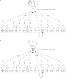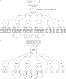 a, Experiential aprreciation, small Self, and positive affect as mediators. b, Experiential aprreciation and tripartite components of meaning as mediators. The latter model and its modified one were used in Studies 5 and 6.