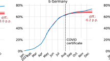 We conclude by listing some limitations and areas for further research. We have abstracted from assessing the mandates’ impact on health outcomes (cases, hospitalizations or deaths). However, vaccine effectiveness estimates from the medical literature can be used to study this further, ideally controlling for possible changes in behaviour. Our focus is on vaccination and certification requirements for non-essential settings, although some locations (such as Italy) expanded the mandates to inter-regional travel or employment, and other countries (such as Greece and Austria) have proposed even broader mandates, which we do not analyse. For data limitation reasons, we also could not study the effect by age group as in ref. 25 or the possible role of past personal sickness outcomes as in ref. 29. See also the Methods for limitations and required assumptions related to the time-series analysis and counterfactuals and our ways of tackling them.
