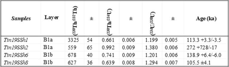 Extended Data Table 3 U/Th ages of snail shells from Tinshemet Cave