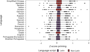 A.D.A. was supported by the South-Eastern Norway Regional Health Authority (no. 2020023). J.L.U. was supported by ANID/CONICYT FONDECYT Iniciación 11190673, Programa de Investigación Asociativa en Ciencias Cognitivas (RU-158-2019), Research Center on Cognitive Sciences, Faculty of Psychology, Universidad de Talca, Chile. P.K. was supported by APVV-22-0458. Y.Z. was supported by the National Natural Science Foundation of China (grant nos 72272048, 72343035, 72432003, 71902164, 71972065, 72272049 and 72102060) and the Post-Funding Project of Philosophy and Social Science Research of the Ministry of Education (grant no. 21JHQ088). S.W. was supported by the Deutsche Forschungsgemeinschaft (DFG) Heisenberg Programme (funding ID: 442405852). Y.A.N., A. Stückler, F.T., M.H.C. and S. Pfattheicher supported the data collection in Danish with Interacting Minds Centre seed grant no. 26254. M. Marelli was supported by ERC Consolidator Grant 101087053 (project ‘BraveNewWord’). A. Sepehri was supported by ESSEC Business School Research Center (CERESSEC). E.M.B. was supported by funding from the Einstein Foundation Award through the PSA, Harrisburg University of Science and Technology, and the Leibniz Institute for Psychology (ZPID). C.H. was supported by the Fund for Scientific Research Flanders (FWO), grant no. FWO G049821N. P.A. was supported by Fundação para a Ciência e Tecnologia through the Research Center CIS-Iscte (UID/PSI/03125/2020). M. Köster was supported by DFG grant no. 290878970-GRK 2271. M. Cavdan was supported by DFG project no. 502774891-ORA project ‘UNTOUCH’. M. A. Vadillo was supported by grant no. PID2020-118583GB-I00 from Agencia Estatal de Investigación (Spain). D. Grigoryev was supported by HSE University Basic Research Program. S.C.R. and P.S. were supported by IDN Being Human Incubator. Y. Yamada was supported by JSPS KAKENHI (JP22K18263). K. Schmidt was supported by the John Templeton Foundation. R.M.R. was supported by the John Templeton Foundation (grant ID: 62631). K.K. was supported by the Austrian Science Fund (FWF) (grant DOI: 10.55776/ESP286). K.B. and E.I. were supported by a grant from the National Science Centre, Poland (2019/35/B/HS6/00528). M.M.E. was supported by Leverhulme Early Career Fellow ECF-2022-761. L.R. was supported by the National Recovery and Resilience Plan (PNRR), Mission 4, Component 2, Investment 1.1, Call for Tender No. 104 published on 2 February 2022 by the Italian Ministry of University and Research, funded by the European Union—NextGenerationEU—project title ‘The World in Words: Moving beyond a spatiocentric view of the human mind (acronym: WoWo)’, project code 2022TE3XMT, CUP (Rinaldi) F53D23004850006; and by the Italian Ministry of Health (Ricerca Corrente 2024). M. Kowal was supported by the Foundation for Polish Science START scholarship. I.R. was supported by Mediated Society (MEDIS:ON) CZ.02.01.01/00/23_025/0008713, which is co-financed by the European Union and by APVV-23-0421. D.M.-R. was supported by a National Master’s Scholarship from the Agencia Nacional de Investigación y Desarrollo of Chile 3537/2023. R.J. was supported by the National Science Center (2020/37/B/HS6/00610). A.M.A. was supported by the OTKA FK 146604 research grant. M. Adamkovič was supported by PRIMUS/24/SSH/017; APVV-22-0458. M. Perea was supported by grant no. CIAICO/2021/172 from the Department of Innovation, Universities, Science and Digital Society of the Valencian Government. J.H.-w.H. was supported by the Research Grant Council of Hong Kong (GRF no. 17608621 to Hsiao). A. Sorokowska was supported by Scientific Excellence Incubator ‘Being Human’. W.D. was supported by the FWO, project no. G049821N. K. Wolfe was supported by the Leverhulme Trust (RPG-2020-035). T.V.P. was supported by the Ministry of Science, Technological Development and Innovation of the Republic of Serbia, according to the contract on the financial support of the scientific research of teaching staff at accredited higher-education institutions in 2024, contract no. 451-03-65/2024-03/200105. Z.P. was supported by the Ministry of Science, Technological Development and Innovation of the Republic of Serbia, as part of the financial support of scientific research at the University of Belgrade—Faculty of Philosophy (contract no. 451-03-66/2024-03/200163). D.A.S.E.-D. was supported by Prince Sultan University through the Applied Linguistics Research Lab (RL-CH-2019/9/1). M. Comesaña was supported by The study corresponding to European Portuguese data was conducted at the Psychology Research Centre (PSI/01662), School of Psychology, University of Minho, and was supported by the Foundation for Science and Technology through the Portuguese State Budget (Ref.: UIDB/PSI/01662/2020). Z.M. and R.Z. were supported by ERDF/ESF project TECHSCALE (no. CZ.02.01.01/00/22_008/0004587). K.F. was supported by a Marie-Curie-Fellowship (882168). F.S. was supported by the Austrian Research Promotion Agency (FFG). S.D.D. was supported by a Social Sciences and Humanities Research Council of Canada grant (grant no. 435-2021-1074). M. Montefinese was supported by the Investment line 1.2 ‘Funding projects presented by young researchers’ (CHILDCONTROL) from the European Union—NextGenerationEU. I.S.P. was supported by a research project implemented as part of the Basic Research Program at the National Research University Higher School of Economics (HSE University). C. Blaison was supported by ANR-18-IDEX-0001 and ANR-20-FRAL-0008. T.N. was supported by the University Excellence Fund of ELTE Eötvös Loránd University, Budapest, Hungary, and the János Bolyai scholarship of the Hungarian Academy of Sciences. D. Muller was supported by Université Grenoble Alpes, Institut Universitaire de France. We thank I. Castillejo for their assistance with data collection. The funders had no role in study design, data collection and analysis, decision to publish or preparation of the paper. An