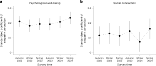 (a) psychological wellbeing as well as. (b) social connectedness in the next quarter after controlling for baseline wellbeing and social connectedness, respectively (Nparticipants = 4970; NObservations = 14437). Blue = significant positive coefficient (p < 0.05); orange = significant negative coefficient (p < 0.05); gray = not significant coefficient.