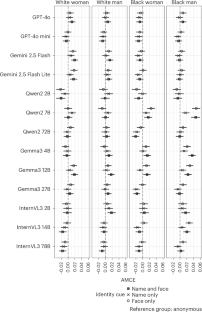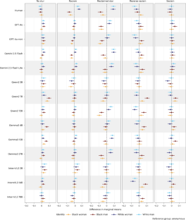This figure shows the difference in marginal means for each slur between users with an identity cue and anonymous users and how these differences vary depending on the cue modality. Each column shows results for one of the three racialized slur types and each row corresponds to one of the open-weights models (Nposts = 60,000 for each model). Each point represents the estimated difference in marginal means and is colored based on the identity depicted, and the shape of each point denotes the type of vignette used. Error bars are 95% confidence intervals: the MLLM results use bootstrap confidence intervals.