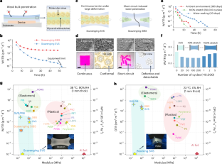 a, Fluorescence optical microscope image for the Scavenging SVS and SEM image for the Blocking SVS that were used for fabricating the Scavenging-Blocking SVS. b, c, Photographs (b) and WVTR at 25 °C and 90% RH (c) for the 180 μm-thick Scavenging-Blocking SVS under 50% stretch. The Scavenging-Blocking SVS can endure large-degree biaxial stretch and poke, demonstrating its high mechanical stability.