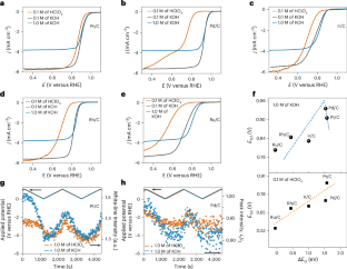 a, O2-saturated 0.1 M HClO4. b, O2-saturated 0.01 M HClO4. c, O2-saturated 0.01 M KOH. d, O2-saturated 0.1 M KOH. e, O2-saturated 1.0 M KOH. Scan rate: 5 mV s−1; rotation rate: 1,600 rpm. f, Specific activity measured at 0.85 V vs. RHE. The comparison showed that the ORR performance of polycrystalline Pd could rival, and even surpass, that of polycrystalline Pt at higher pH values, despite polycrystalline Pd being significantly less active than Pt at lower pHs.