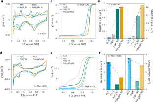 CV and ORR polarization data in alkaline media plotted in Fig. 3a,b, CV and ORR polarization data in acidic media plotted in Fig. 3d,e and the corresponding mass and specific activity data plotted in Fig. 3c,f.