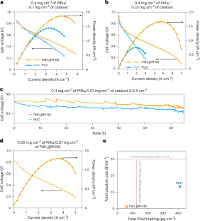 AEMFC polarization and power density data plotted in Fig. 6a,b,d, stability test data plotted in Fig. 6c and data of cost versus PGM loading analysis plotted in Fig. 6e.