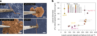 Operando SEM electrochemical data of the lateral diameter of Li electroplating and the local current density at failure in various LLZO samples plotted in Fig. 4b.