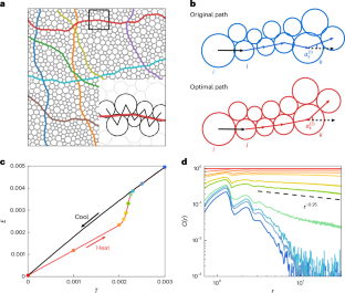 Monodisperse crystals with the same interacting potential and packing fraction as our ideal-non-crystal system are heated and then cooled down using molecular dynamics simulations, with a constant heating (cooling) rate dT/dt = 10−9. a, Temperature dependence of potential energy per particle E during heating (red line) and cooling (black line) processes. The evolution of E during melting resembles that of ideal non-crystals, suggesting a similar physical mechanism of melting. Marginal hysteresis is observed between cooling and heating, differing from the ideal-non-crystal system. For state points indicated in a, the structural correlations are characterized in three different ways: The conventional correlation function of the hexatic order parameter \({G}_{6}(r)=\langle {\Psi }_{6}^{* }(r){\Psi }_{6}(0)\rangle\) (b), the correlation of Ψ6 along the coherent path \({G}_{6}^{p}(r)\) (c), and the path-integral-like correlation function C(r) defined in this work (d). The dashed line is the power-law scaling predicted by the KTHNY theory of two-dimensional melting from hexatic phase to liquids. A close comparison confirms prefect agreement between them, validating the efficacy of our methodology. In essence, our path-integral-like scheme, based on the definition of the coherent path and the corresponding correlation function, captures the structural coherence from the steric constraint of triangle units. For monodisperse systems, the steric order reduces to the hexatic orientational order, making C(r) and G6(r) give essentially the same information.