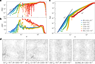 We characterise crystals with extremely weak polydispersities to demonstrate their similarity to ideal non-crystals. a, Visualisation of a typical crystalline configuration with a polydispersity Δ = 0.231% and steric order Θ = 1.58 × 10−3 (approximately the same as ideal non-crystals). The packing fraction is set to ϕ = 0.92 and particles are coloured according to their steric order Θ. b, The bare configuration corresponding to a without colour coding, which is visually indistinguishable from a perfect hexagonal crystal. This plot gives some intuitive sense of how ordered the obtained ideal non-crystals are compared to the underlying perfect state (Θ=0). c, Spectral density χV(k) for weakly polydisperse crystals with different degree of steric order Θ. The corresponding polydispersities are Δ = 1.155%, 0.577%, 0.231%, 0.115%, and 0.058% for decreasing Θ. d, The plateau value of spectral density when approaching the low-k limit χV(k → 0) as a function of steric order Θ. The dashed line is a power-law extrapolation fitting of the data χV(k → 0) ~ Θ2.
