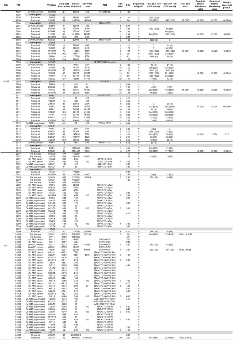 Extended Data Table 1 Extended information about sample collection, viral loads, cell counts, sequencing results, and compartmentalization tests
