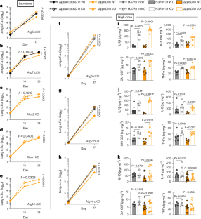 (a) Atg5 and Atg7 Cre−/− (WT) control mice were infected by aerosol with low dose ΔppsD or ΔppsD::ppsD Mtb. (b) Atg5, Atg7 and Atg14 Cre−/− (WT) littermate control mice were infected by aerosol with high dose H37Rv (WT) or ΔppsD Mtb as shown in Fig. 3. The cytokine levels in lung homogenates were analyzed by multiplex cytokine kit (a) 14 dpi and (b) 17 dpi. Each data point represents one mouse; n = 10 mice per group for panel a, and n = 15 mice per group for panel b; data show the mean ± SEM; p value from unpaired, two-tailed t test.