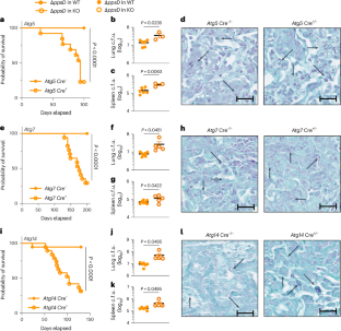(a-h) (a and f) Atg5 cKO; (b and g) Atg7 cKO; (c) Nox2 KO; (d) Rbcn KO; and (e and h) Atg14 cKO mice and their littermate controls were infected by aerosol with (a-e) low dose (CFU ~ 100) ΔppsD or ΔppsD::ppsD or (f-h) high dose (CFU ~ 1000-1500) GFP-expressing H37Rv (WT) or ΔppsD Mtb as described in Fig. 3. (a-e) In low dose experiments, CFU were enumerated from spleen 17 dpi for Atg5 cKO and 14 and 28 dpi for Atg7 cKO, Atg14 cKO, Nox2 KO and Rbcn KO; n = 5 per group for Atg5 cKO, Atg7 cKO, Atg14 cKO, and Rbcn KO while n = 10 per group for Nox2 KO. (f-h) In high dose experiments, CFU were enumerated from spleens at 17 dpi, and n = 5 mice per group for all indicated strains. All low and high dose experiments were done twice except Atg7 cKO at low dose. The Atg7 cKO was tested once at low dose, and 2 times at high dose. Data show the mean ± SEM; p-value from Brown Forsythe and Welch ANOVA with Dunnett’s (T3) multiple comparisons test with pre-selected comparisons for panel a, b, f-h and unpaired two-tailed t test for panel c-e.