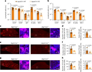 (a-c) Atg5, Atg7 or Atg14 cKO and littermate control mice were infected by aerosol with high dose (CFU ~ 1000-1500) GFP-expressing H37Rv or ΔppsD, and lungs were harvested 17 dpi for flow cytometry as described in Fig. 4. Number of (a) myeloid and (b) lymphoid cells from infected lungs of all WT (Cre−/− mice. (c) Number of NK1.1 cells from indicated Atg cKO mice. Each data point represents one mouse. Data consists of 15-20 mice per group for panel a and b, and 9-15 mice per group for panel c. Error bars indicate SEM; p-value from Brown Forsythe and Welch ANOVA with Dunnett’s (T3) multiple comparisons test with pre-selected comparisons.