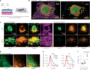 Representative 3D rendering videos showing differences in tolerance to ciprofloxacin of mixed infections forming large (left) or small (right) biofilms. The two distinct regions shown were collected in the same AirGel, located millimeters apart. WT is shown in orange, ∆wspF is shown in green, and the epithelium is shown in magenta. The full time-lapse rendering of the imaging data shown in Fig. 6c.