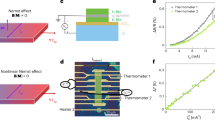 We present the longitudinal transport characteristics of a representative device (Fig. 1b), demonstrating clear ambipolar transport in few-layer InSe (ref. 30). We perform thermoelectric power measurements at 100 mK in a dilution refrigerator by performing scanning photocurrent (and photovoltage) measurements, in both d.c. and a.c. using a lock-in amplifier (Methods and Supplementary Note 6). Figure 1c depicts a false-colour image of a three-layer Gr/InSe device, with a superimposed spatial map illustrating the photoinduced Nernst effect signal within the field of view. The Nernst effect is characterized by the emergence of a transverse current (voltage) on laser illumination at the edges of the channel19. Such illumination induces an uncompensated thermal gradient that drives the current along the channel when the sample is subjected to a magnetic field19,20. Importantly, this signal changes sign at opposite magnetic-field polarities and remains consistent across the length of the channel as the laser is scanned, exhibiting a uniform profile that changes sign at opposite edges of the flake, in accordance with the principles outlined in the Shockley–Ramo theorem34.