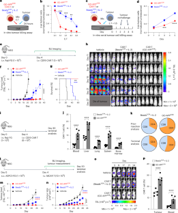 a-b, Study of the in vivo persistency and biodistribution of GO-APP3/28 CAR-T cells in a human Raji-FG xenograft mouse model (see Fig. 3i for study design). a, Representative flow plots of Fig. 3j showing biodistribution of GO-APP3/28 CAR-T cells across tissues collected at the terminal analysis. b, Representative flow plots of Fig. 3k showing phenotyping of GO-APP3/28 CAR-T cells liver at the terminal analysis. c, Study of in vivo persistency and biodistribution of GO-APP3/28 CAR-T cells in a human AsPC-1-FG xenograft mouse model (see Fig. 3l for study design). Representative flow plots of Fig. 3p showing persistence of GO-APP3/28 CAR-T cells in tumor and peripheral blood at the terminal analysis.
