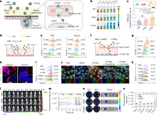 a, Representative CLSM 3D visualization images of CT26 cells in the lower chamber. Scale bar, 50 μm. b, Representative CLSM images showing colocalization of nanocomplexes and mucus in mouse colon after 15 min incubation. Scale bar, 200 μm. c,d, Representative CLSM images of nanocomplexes penetration into tumour cell clusters from apex to equator with 20 μm z-spacing (c); fluorescence intensity distribution of nanocomplexes at 60 μm depth (d). Scale bar, 50 μm.