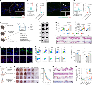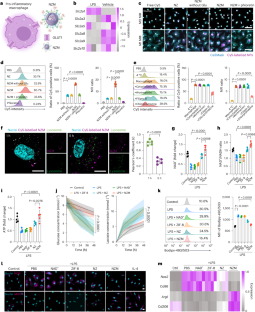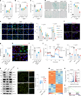 a, Schematic representation of the interactions between senescent stem cells and inflammatory macrophages. Created in BioRender. Liang, K. (2025) https://BioRender.com/ou25z6p. b, Schematic illustration of the systemic remodeling of the regenerative niche following NZM treatment. Created in BioRender. Liang, K. (2025) https://BioRender.com/g9snj9v. c, Schematic diagram of the experimental design of the paracrine effects of senescent MSCs. Created in BioRender. Liang, K. (2025) https://BioRender.com/8i38cqy. d, Relative mRNA expression of Il1β, Nos2, Arg1 and Cd206 in macrophages determined by qRT-PCR. n = 4 biologically independent samples. e, f, Representative microscopy images (e) and quantification (f) of iNOS and ARG1 in macrophages. n = 4 biologically independent samples. Scale bars, 50 μm. g, Levels of cytokines secreted by macrophages determined by ELISA. n = 4 biologically independent samples. For panels d–g, the groups represent cells in the Transwell chamber. The Control group represents young MSCs in the Transwell chamber, the Aged group consists of senescent MSCs, and the Aged+NZM group represents NZM-treated senescent MSCs. h, Schematic diagram of the experimental design of the paracrine effects of macrophages. Created in BioRender. Liang, K. (2025) https://BioRender.com/a2j1cv8. Macrophages were stimulated with LPS (100 ng ml−1) and treated with or without NZM (10 µM, based on NAD+) for 24 h. The culture supernatants were then collected and used to treat MSCs for 7 days. i, j, Representative microscopy images (i) and quantification (j) of SA-β-Gal staining in MSCs. Scale bars, 100 μm. k, Relative mRNA expression of Cdkn1a, Cdkn2a, p53, Il6 and Il18 in MSCs determined by qRT-PCR. n = 4 biologically independent samples. For panels i–k, the group labels indicate the specific interventions applied to macrophages. Data are presented as mean ± s.d. (d, f, g, j, k). P values were calculated using using one-way ANOVA followed by Tukey’s two-sided post hoc multiple-comparison test (d, f, g, j, k).