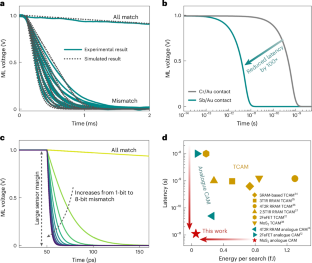 Lin, C.-C. et al. 7.4 A 256 b-wordlength ReRAM-based TCAM with 1 ns search time and 14× improvement in wordlength–energy-efficiency–density product using 2.5T1R cell. In Proc. 2016 IEEE International Solid-State Circuits Conference (ISSCC) 136–137 (IEEE, 2016).