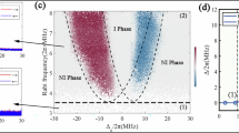 The laser beams were focused to equal Gaussian waists of w0 = 100 μm and combined with the use of dichroic mirrors (Extended Data Fig. 1f). The probe beam counterpropagated with respect to the other fields and its transmission through the 85Rb medium was then utilized as a means of calibration via EIT effects (Fig. 1d,e). The length of the vapour cell was 50 mm. The collinear laser field configuration was facilitated with 4f optical systems (not shown on the scheme) with mirrors at focal planes, enabling independent control of every beam’s position and propagation angle. The effective peak Rabi frequencies used for the 780 nm, 480 nm and 1258 nm laser fields were derived from the numerical simulation as Ωp = 8 × 2π MHz, Ωc = 22 × 2π MHz and Ωd = 17 × 2π MHz respectively. The optimal dominant detuning from the 55D level was measured as Δ55D = 16 × 2π MHz (Fig. 4a) and was used for the other measurements, with the other detunings being near zero. For Fig. 1 and Extended Data Fig. 1e the MW Rabi frequency was set to about ΩMW = 8 × 2π MHz, while for the Figs. 3 and 4a it was deep inside the unsaturated regime. For the Fig. 4a the decoupling intensity was increased to about Ωd = 25 × 2π MHz peak. The calibration of detuning zero points took place at the 85Rb working temperature to account for pressure shifts of the Rydberg energy levels.