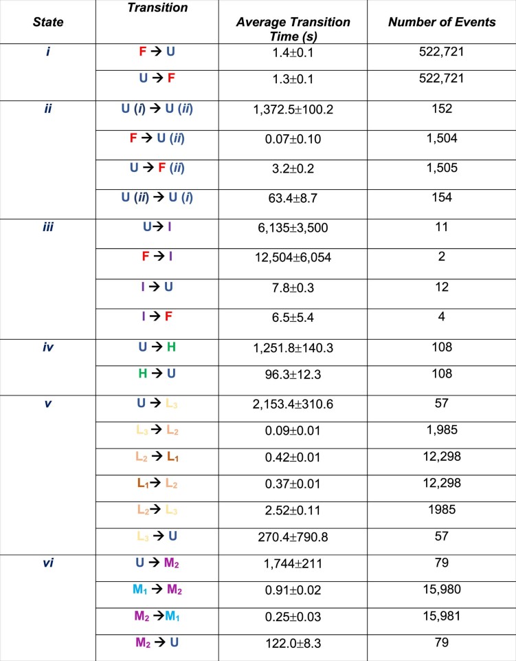 Extended Data Table 2 Kinetic analysis of average transition times between the different conformations