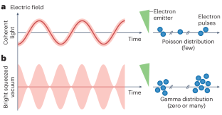 When photons impinge on a material, free electrons can be created by the photoelectric effect. The emitted electron current usually fluctuates with Poisson statistics, but if squeezed quantum light is applied, the electrons bunch up.