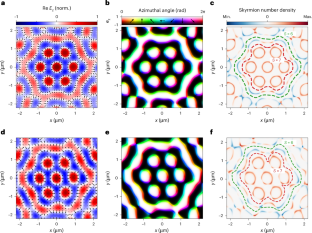 a, d, Electric field distribution. The out-of-plane component is illustrated using the color plot and the in-plane component of the electric field is depicted using the vector plot. b, e, Distributions of the out-of-plane amplitude (brightness) and in-plane orientation (color) of the normalized electric field. Colorful areas indicate closed-loop lines, along which the electric field vectors only have an in-plane component. The in-plane orientation of the field vectors rotates by \(2\pi\) along these lines of all skyrmions. c, f, Skyrmion number density of the electric field. Integration of the skyrmion number density yields the total skyrmion number. For the total bag the integrated area is given by the enclosed space inside the green dashed line. The skyrmion cluster only counts the skyrmions inside the bag which means that the skyrmion number density is integrated within the area surrounded by the dashed red line.