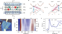 Hybridization between intervalley interlayer excitons with opposing dipoles is allowed from a symmetry perspective, as these excitons, such as \({{\rm{IX}}}_{{\rm{T}},{{\rm{K}}}^{{\prime} }}\) and IXB,K (depicted in red in Fig. 1b), have the same AQNs. Even without electron doping the sample, these could hybridize with each other via direct Coulomb interactions: either via exciton exchange16,17, expected to be weak because of the reduced transition dipole moment of interlayer excitons compared with intralayer ones, or via a process involving the scattering of the \({{\rm{IX}}}_{{\rm{T}},{{\rm{K}}}^{{\prime} }}\)-exciton electron and hole across the TMD BZ, which is suppressed because it occurs at a large momentum \({\boldsymbol{K}}-{{\boldsymbol{K}}}^{{\prime} }\) and involves electron and hole layer switching (Supplementary Section XI). Thus, such direct coupling is expected to be weak, consistent with \(| {{\mathcal{W}}}_{0}| \lesssim 2\,{\rm{meV}}\) for n = 0 (Fig. 2e). Doping the sample could enhance such hybridization mechanisms via simple effects such as trion formation, polaronic dressing or Fermi sea fluctuations, possibly explaining the emergence of non-zero mean coupling \({{\mathcal{W}}}_{0}\ne 0\) and the density trend in Fig. 2e (such dynamical electron-enhanced exciton hybridization is still expected to be suppressed, consistent with our measurements in Fig. 2e,f, as further discussed in Supplementary Section XI). The intensity asymmetry in Fig. 3b (right) could arise from the presence of doped electrons indistinguishable from the corresponding exciton electron. Increasing temperature weakens polaronic dressing effects18 and increases exciton scattering off phonons19, which reduces exciton wave-function overlaps. Both effects may contribute to explaining decreasing \(| {{\mathcal{W}}}_{0}|\) with increasing T as observed in Fig. 2f.