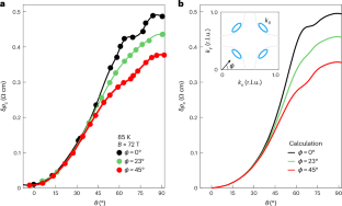 a, Magnetoresistivity δρc as a function θ for ϕ = 0∘, 23∘ and 45∘. b, Simulations for a reconstructed Fermi surface resulting from bi-axial charge-density-wave previously studied at low temperatures (T ≲ 4 K)12,39,40 This pocket has four-fold planar symmetry in agreement with the symmetry of the measured linear slope of magnetoresistivity a1(ϕ) for in-plane fields, but it cannot capture the observed evolution of the Yamaji effect shown in panel a. c & d, Simulations for slight variations of the curvature of the reconstructed CDW pocket, while keeping the enclosed area of the pocket the same. The insets shows a closeup of the reconstructed pocket (reproduced from panel b inset) in blue and the modified pocket in red. Experimentally, the Yamaji peak for ϕ = 0∘ is more pronounced than that for ϕ = 45∘. The opposite is always found for simulations of the CDW pocket.