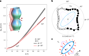 a–d, Magnetoresistivity field sweeps underlying the ϕ dependence plots in Fig. 3b, covering approximately 180∘ angular range. θ = 90∘ for all curves, corresponding to magnetic field applied in the plane. Lower panels are the derivative with respect to field, showing a crossover to linear magnetoresistance in all curves. T = 85 K.