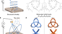 Chirality of the LC host medium is essential for heliknoton stability as the chiral term in the free-energy functional allows for the (meta)stability of both helical background and heliknotons. Reversing the handedness of the host medium gives origin to the hopfions of opposite charge Q (refs. 33,34), which can be checked by consistently vectorizing the circulations of preimages47. The vortex knots, preimage links and host chiral LC medium are chiral, with the knot chirality preserved during elementary relinking operations within fusion and fission (Extended Data Fig. 10a,b). In fact, all isotopes of vortex atoms can be thought of as obtained by relinking operations within the knots. Switching handedness of the host medium leads to energy-minimizing knots of opposite handedness, too. Although most known knots in mathematics are chiral and achiral knots are rather rare, one can ask whether achiral knots can be possibly obtained from the fusion of energetically stabilized elementary chiral knots. Although we did not obtain such achiral knots in experiments or numerical analyses so far, we identified a scenario in which specific series of band surgeries could lead to such achiral knots (Extended Data Fig. 10c), provided that both end and intermediate states are energy-minimizing structures under suitable material parameters and voltage-driving schemes, or in response to other external stimuli. Thus, our experimentally accessible system can be used to explore the interplay between chirality at hierarchically different levels, from that of chiral carbon centres of chiral dopant molecules within the LC to that of the chiral nematic host medium and to particle-like vortex knots embedded in it.