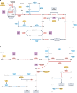 Lane, A. N. & Fan, T. W.-M. Regulation of mammalian nucleotide metabolism and biosynthesis. Nucleic Acids Res. 43, 2466–2485 (2015). This review provides a quantitative analysis of the (d)NTP requirements of proliferating mammalian cells, as well as a comprehensive discussion of how (d)NTP pools are expanded to support cell division under physiological conditions.