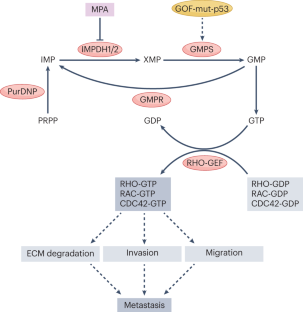 Kollareddy, M. et al. Regulation of nucleotide metabolism by mutant p53 contributes to its gain-of-function activities. Nat. Commun. 6, 7389 (2015). This study linked oncogenic gain-of-function p53 mutation to purine metabolism and showed the critical role of de novo GTP synthesis in promoting metastasis through the activation of RHO-family GTPases.