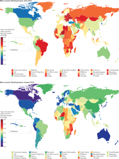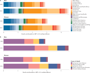 High blood pressure is one of the most important risk factors for ischaemic heart disease, stroke, other cardiovascular diseases, chronic kidney disease and dementia. Mean blood pressure and the prevalence of raised blood pressure have declined substantially in high-income regions since at least the 1970s. By contrast, blood pressure has risen in East, South and Southeast Asia, Oceania and sub-Saharan Africa. Given these trends, the prevalence of hypertension is now higher in low-income and middle-income countries than in high-income countries. In 2015, an estimated 8.5 million deaths were attributable to systolic blood pressure >115 mmHg, 88% of which were in low-income and middle-income countries. Measures such as increasing the availability and affordability of fresh fruits and vegetables, lowering the sodium content of packaged and prepared food and staples such as bread, and improving the availability of dietary salt substitutes can help lower blood pressure in the entire population. The use and effectiveness of hypertension treatment vary substantially across countries. Factors influencing this variation include a country’s financial resources, the extent of health insurance and health facilities, how frequently people interact with physicians and non-physician health personnel, whether a clear and widely adopted clinical guideline exists and the availability of medicines. Scaling up treatment coverage and improving its community effectiveness can substantially reduce the health burden of hypertension.