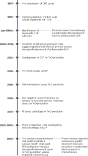 Randomized trials have revealed that molecularly guided therapy and immunotherapy improve progression-free survival compared with standard platinum-based chemotherapy in patients with newly diagnosed unfavourable CUP, in both ToO-informed and histology-agnostic settings.