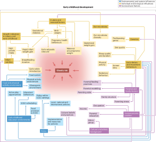 The prevalence of obesity increases with age but is apparent even in early life. Early childhood is a critical period for development that is known to influence future health. Even so, the focus on obesity in this phase, and the factors that affect the development of obesity, has only emerged over the past two decades. Furthermore, there is a paucity of iterative work in this area that would move the field forward. Obesity is a complex condition involving the interplay of multiple influences at different levels: the individual and biological level, the sociocultural level, and the environmental and system levels. This Review provides a brief overview of the evidence for these factors with a focus on aspects specific to early life. By spotlighting the complex web of interactions between the broad range of influences, both causal and risk markers, we highlight the complex nature of the condition. Much work in the early life field remains observational and many of the intervention studies are limited by a focus on single influences and a disjointed approach to solutions. Yet the complexity of obesity necessitates coordinated multi-focused solutions and joined-up action across the first 2,000 days from conception, and beyond.