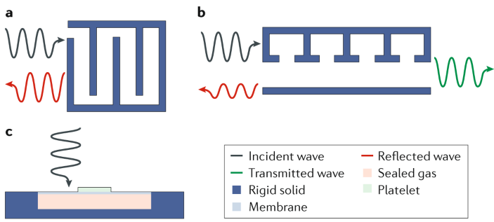 In addition to acoustic metasurfaces for airborne sound, acoustic metasurfaces that can operate in water or other fluids may be used in underwater acoustics, cloaking125 and medical applications, including bioimaging and therapeutics126,127. Compared with air, water has a lower contrast in acoustic properties to most solid materials, which favours the design of structures with a desired phase and an impedance matched to the water environment. However, the rigid-wall assumption, which is crucial in many metasurface unit cells, becomes less accurate, and the viscous layer complicates the propagation path and increases loss.