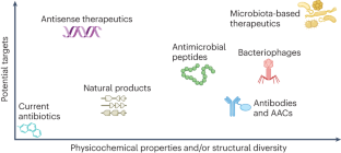 Resistance threatens to render antibiotics — which are essential for modern medicine — ineffective, thus posing a threat to human health. The discovery of novel classes of antibiotics able to overcome resistance has been stalled for decades, with the developmental pipeline relying almost entirely on variations of existing chemical scaffolds. Unfortunately, this approach has been unable to keep pace with resistance evolution, necessitating new therapeutic strategies. In this Review, we highlight recent efforts to discover non-traditional antimicrobials, specifically describing the advantages and limitations of antimicrobial peptides and macrocycles, antibodies, bacteriophages and antisense oligonucleotides. These approaches have the potential to stem the tide of resistance by expanding the physicochemical property space and target spectrum occupied by currently approved antibiotics.