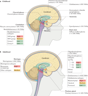 These tumour subtypes contain tumour-associated microglia and/or macrophages that can vary in number and phenotype.